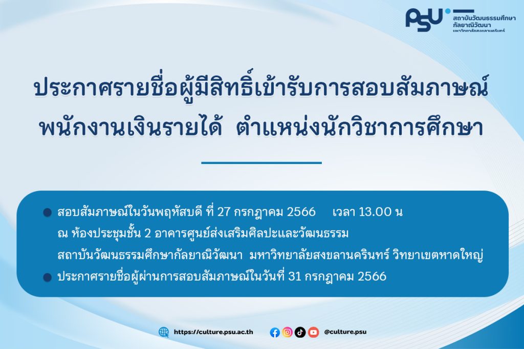 ข่าวรับสมัครงาน, ข่าวสารประชาสัมพันธ์ประกาศรายชื่อผู้มีสิทธิ์เข้ารับการสอบสัมภาษณ์ พนักงานเงินรายได้ ตำแหน่งนักวิชาการศึกษา sannusee / 21 กรกฎาคม 2023 ประกาศรายชื่อผู้มีสิ