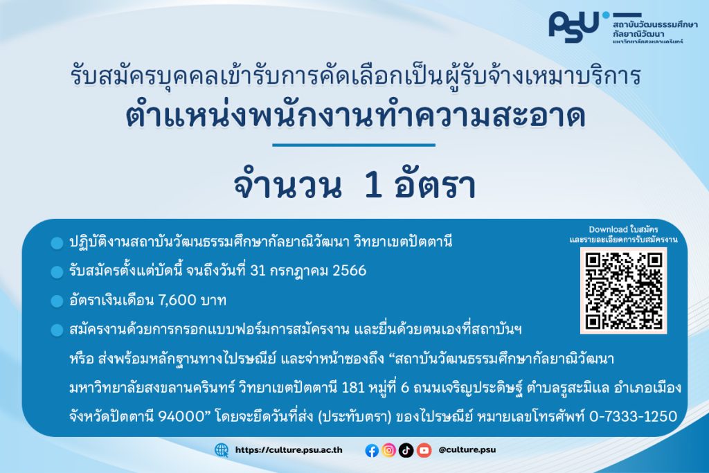 ข่าวรับสมัครงาน, ข่าวสารประชาสัมพันธ์ประกาศรับสมัครบุคคลเข้ารับการคัดเลือกเป็นผู้รับจ้างเหมาบริการ ตำแหน่ง พนักงานทำความสะอาดอาคาร sannusee / 14 กรกฎาคม 2023 ดาวน์โหลดใบสมัครและร