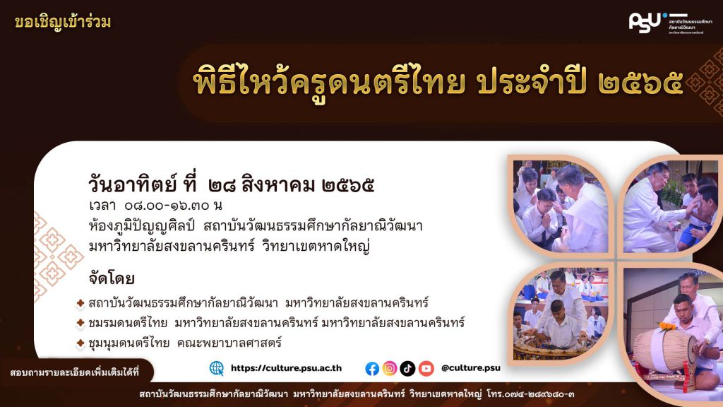 ข่าวสารประชาสัมพันธ์ขอเชิญร่วมพิธีไหว้ครูดนตรีไทย ประจำปี 2565 sannusee / 22 สิงหาคม 2022 ข่าวดีสำหรับศิษยานุศ