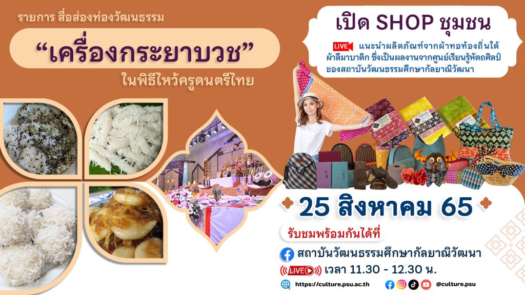 ข่าวสารประชาสัมพันธ์Live รายการสื่อส่อง…ท่องวัฒนธรรม ตอน “เครื่องกระยาบวช” ในพิธีไหว้ครูดนตรีไทย sannusee / 24 สิงหาคม 2022 25 สิงหาคม 2565 นี้