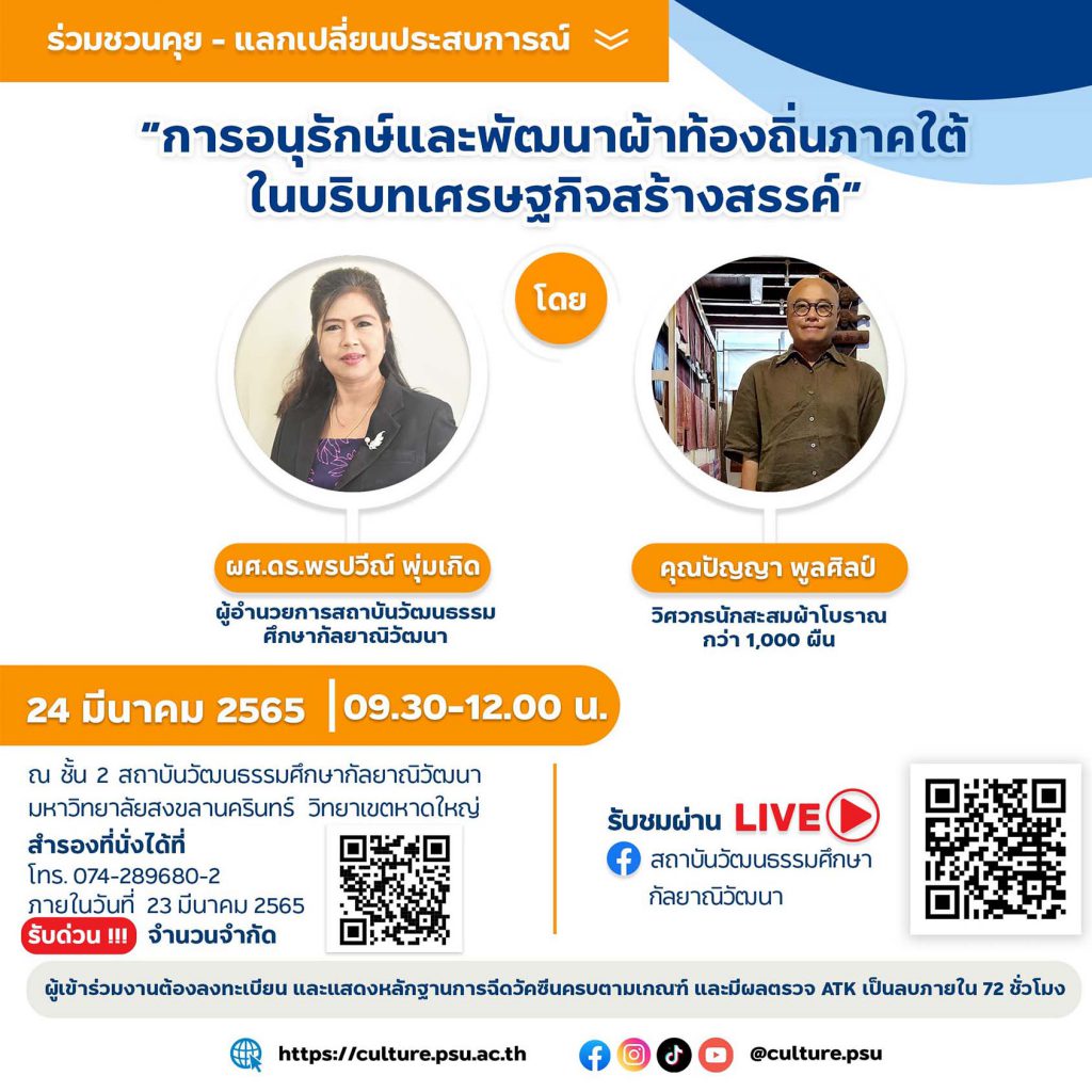 ข่าววิทยาเขตหาดใหญ่, ข่าวสารประชาสัมพันธ์โครงการ “การจัดการพื้นที่และทุนทางวัฒนธรรมเพื่อสร้างเสริมศักยภาพ ผู้ประกอบการและวิสาหกิจวัฒนธรรม : การขยายต่อยอดการพัฒนาเศรษฐกิจฐานวัฒนธรรม จังหวัดปัตตานี” sannusee / 18 มีนาคม 2022 วันที่ 24 มีนาคม 256
