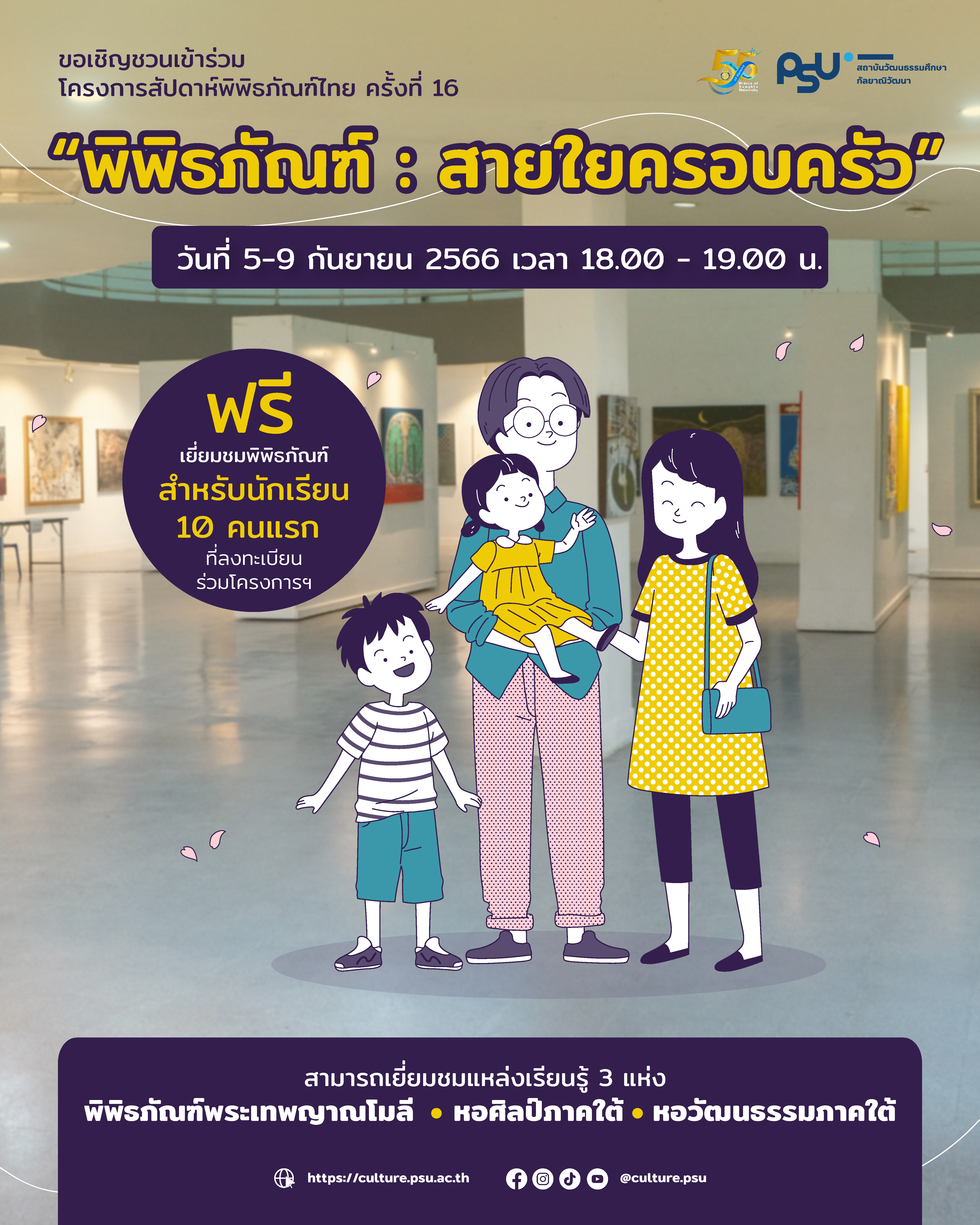 ข่าววิทยาเขตปัตตานี, ข่าวสารประชาสัมพันธ์ขอเชิญชวนเข้าร่วมโครงการสัปดาห์พิพิธภัณฑ์ไทย ครั้งที่ 16 “พิพิธภัณฑ์ : สายใยครอบครัว” sannusee / 7 กันยายน 2023 สถาบันวัฒนธรรมศึกษาก