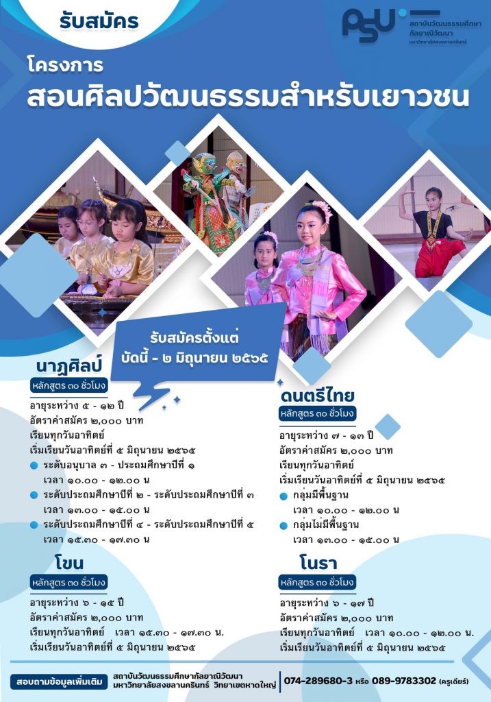 สถาบันวัฒนธรรมศึกษากัลยาณิวัฒนา มหาวิทยาลัยสงขลานครินทร์ วิทยาเขตหาดใหญ่ โทร. ๐๗๔-๒๘๙๖๘๐-๓ หรือ ๐๘๙-๙๗๘๓๓๐๒ (ครูเดียร