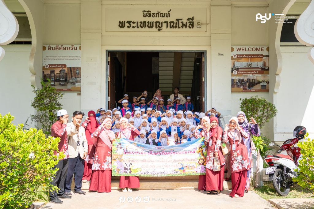 29 มกราคม 2569 สถาบันวัฒนธรรมศึกษากัลยาณิวัฒนา มหาวิทยาลัยสงขลานครินทร์ ให้การต้อนรับคุณครูและนักเรียนจากโรงเรียนอัลเราะห์มานวิทยา อำเภอระแงะ จังหวัดนราธิวาส เข้าเยี่ยมชมแหล่งเรียนรู้ด้านศิลปะและวัฒนธรรมชายแดนใต้ ณ หอศิลปวัฒนธรรมภาคใต้ พร้อมเยี่ยมชม พิพิธภัณฑ์เรือนอำมาตย์โทพระยาพิบูลพิทยาพรรค และนิทรรศการเหรียญตราและเครื่องถ้วย ณ พิพิธภัณฑ์พระเทพญานโมลี