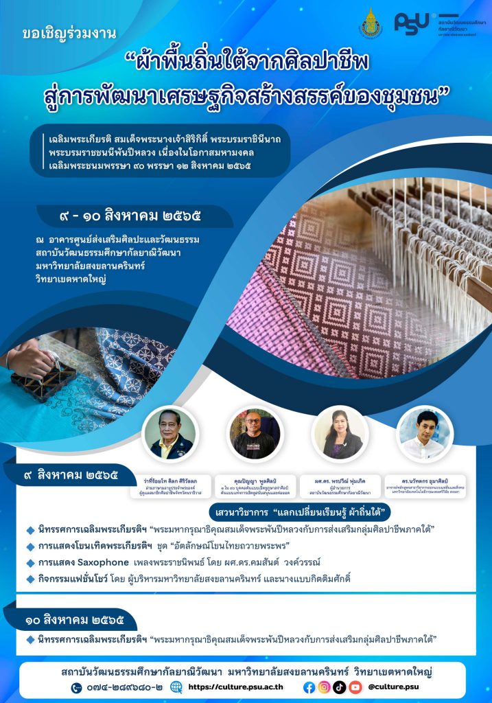 ขอเชิญร่วมงาน “ผ้าพื้นถิ่นใต้จากศิลปาชีพสู่การพัฒนาเศรษฐกิจสร้างสรรค์ของชุมชน” เพื่อเฉลิมพระเกียรติ สมเด็จพระนางเจ้าสิริกิติ์ พระบรมราชินีนาถ พระบรมราชชนนีพันปีหลวง เนื่องในโอกาสมหามงคลเฉลิมพระชนมพรรษา 90 พรรษา 12 สิงหาคม 2565