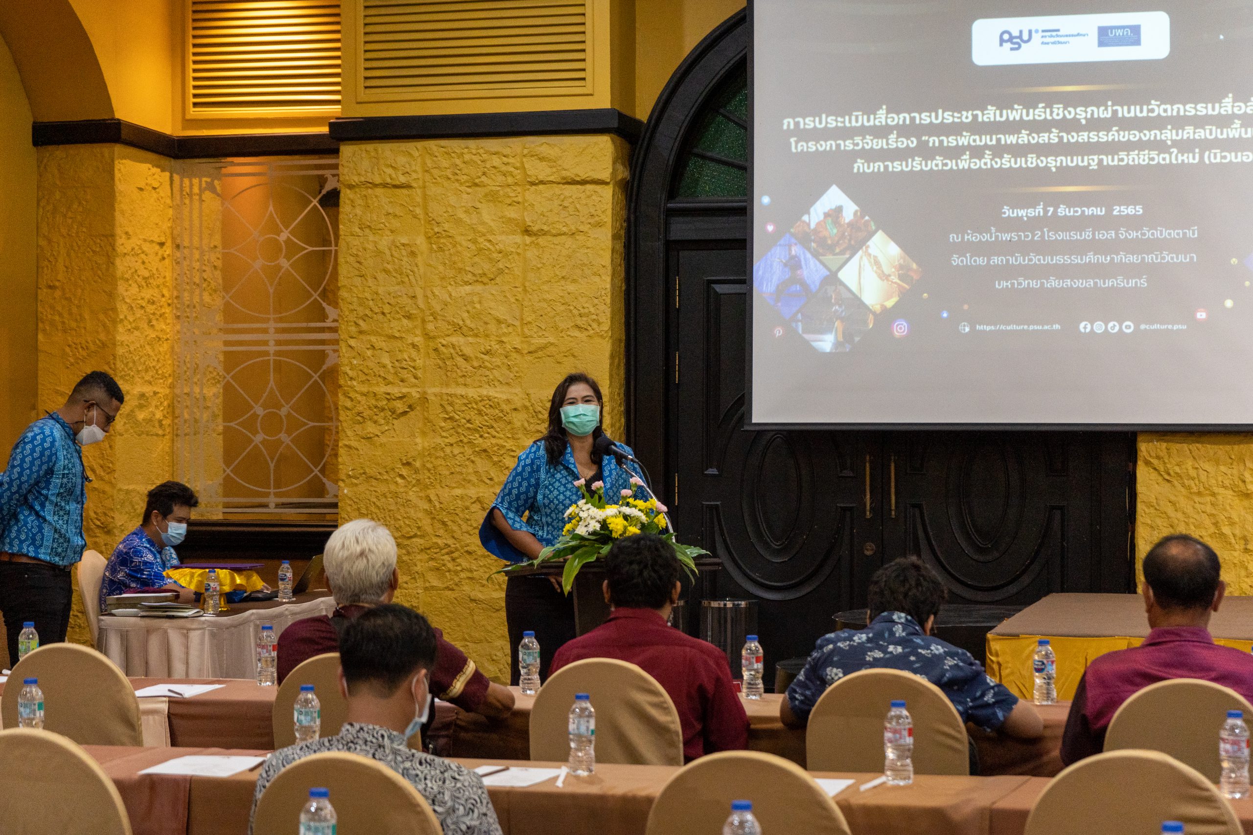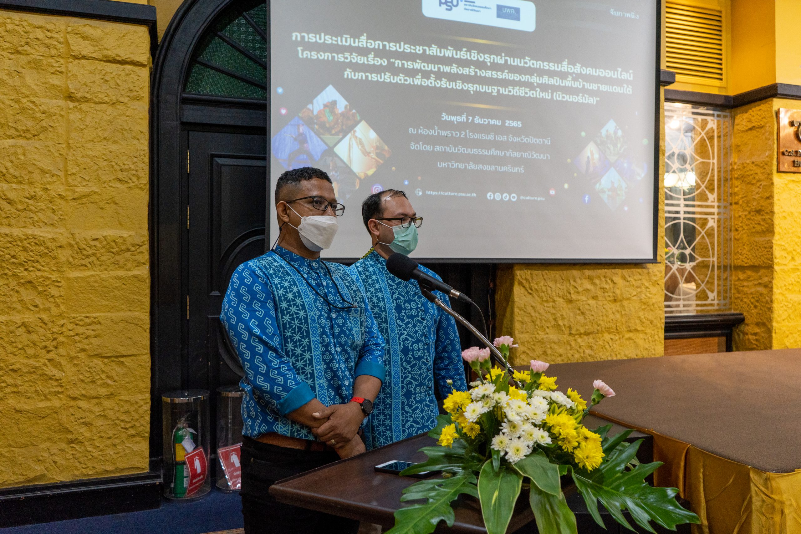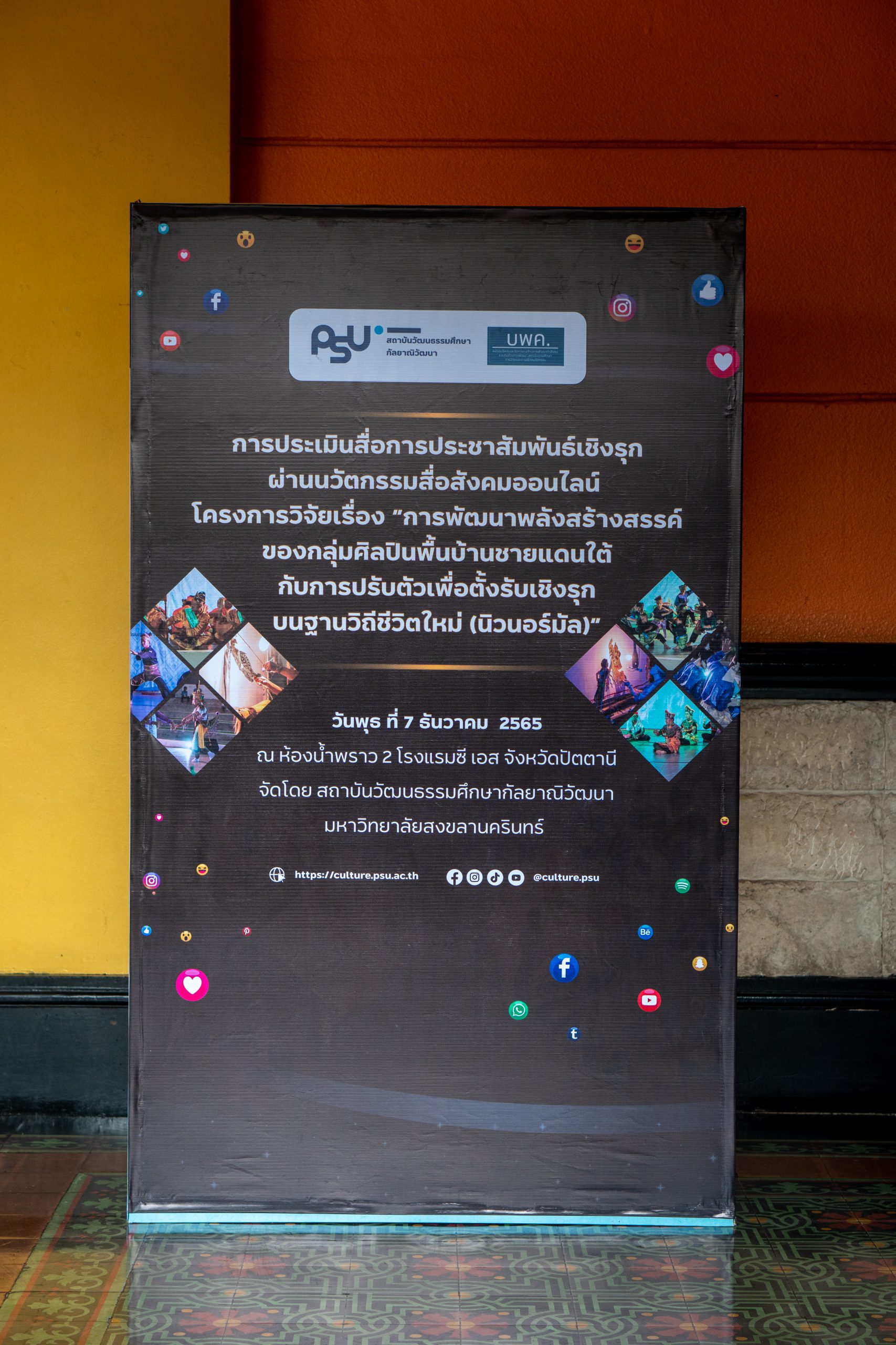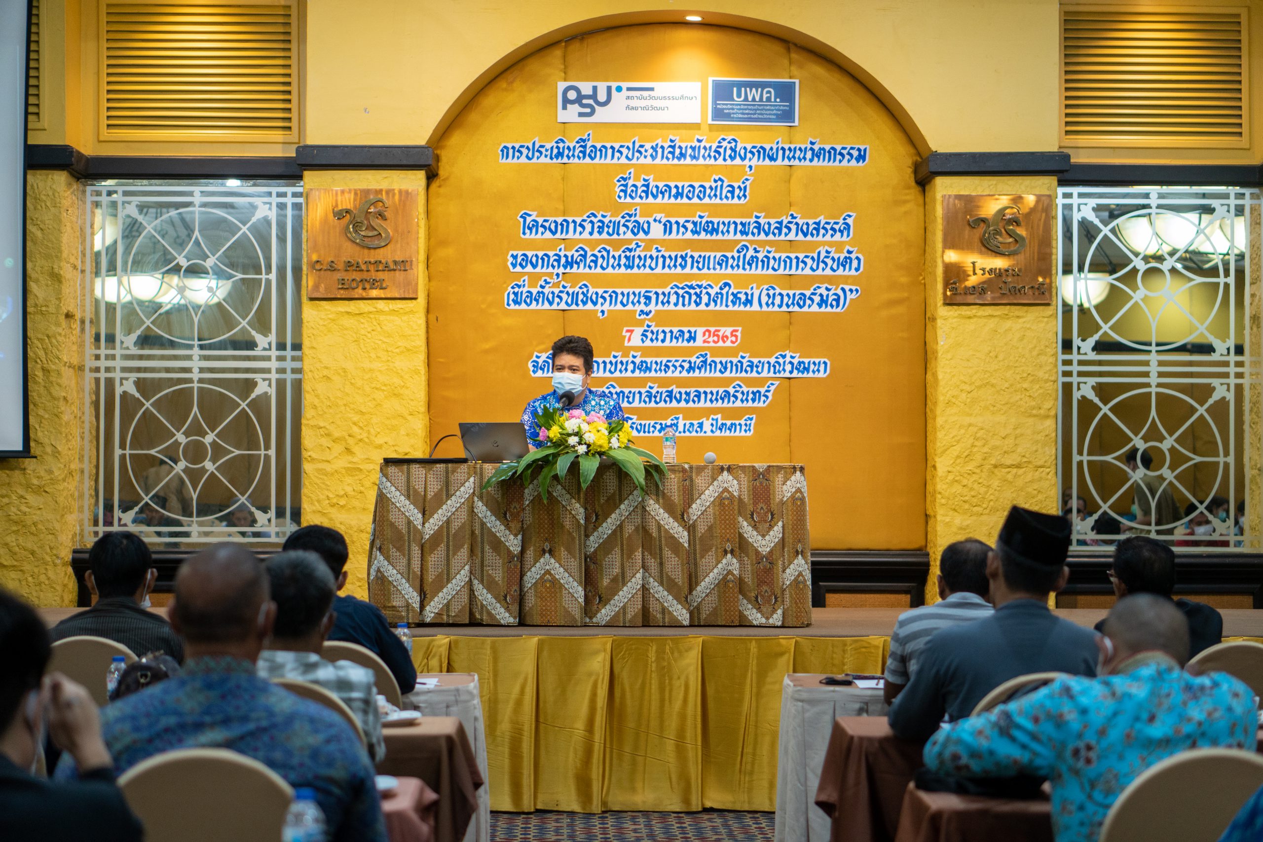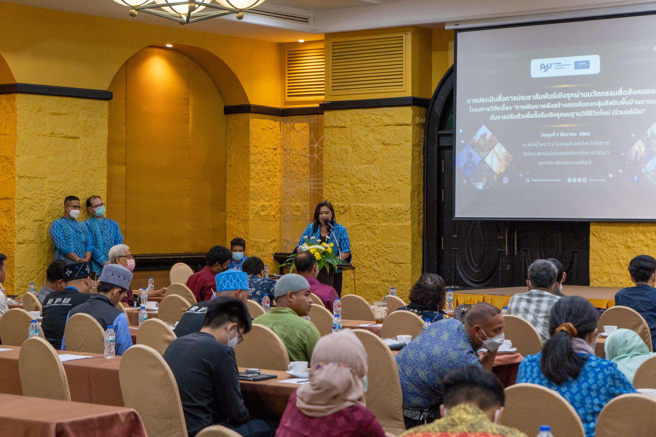 สถาบันวัฒนธรรมศึกษากัลยาณิวัฒนา นำโดย ผู้ช่วยศาสตราจารย์ ดร.พรปวีณ์ พุ่มเกิด หัวหน้าโครงการวิจัยฯ / ผู้อำนวยการ พร้อมกับ ดร.ชนกิตติ์ ธนะสุข รองผู้อำนวยการ และนักวิจัยบุคลากรสถาบันฯ จัดกิจกรรมการประเมินสื่อการประชาสัมพันธ์เชิงรุกผ่านนวัตกรรมสื่อสังคมออนไลน์ โครงการวิจัยเรื่อง “การพัฒนาพลังสร้างสรรค์ของกลุ่มศิลปินพื้นบ้านชายแดนใต้กับการปรับตัวเพื่อตั้งรับเชิงรุกบนฐานวิถีชีวิตใหม่ (นิวนอร์มัล)” โดยมี นางศศิเพ็ญ ละม้ายพันธุ์ วัฒนธรรมจังหวัดปัตตานี เป็นประธานในพิธี และมีตัวแทนจากวัฒนธรรมจังหวัดยะลา นราธิวาส เข้าร่วมด้วย
