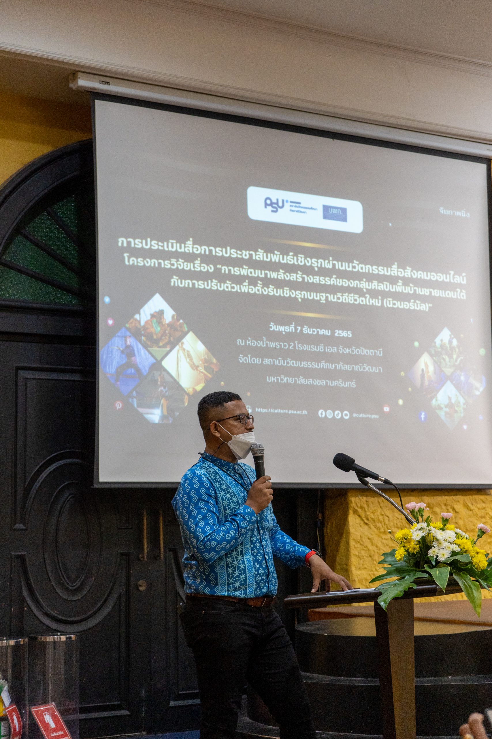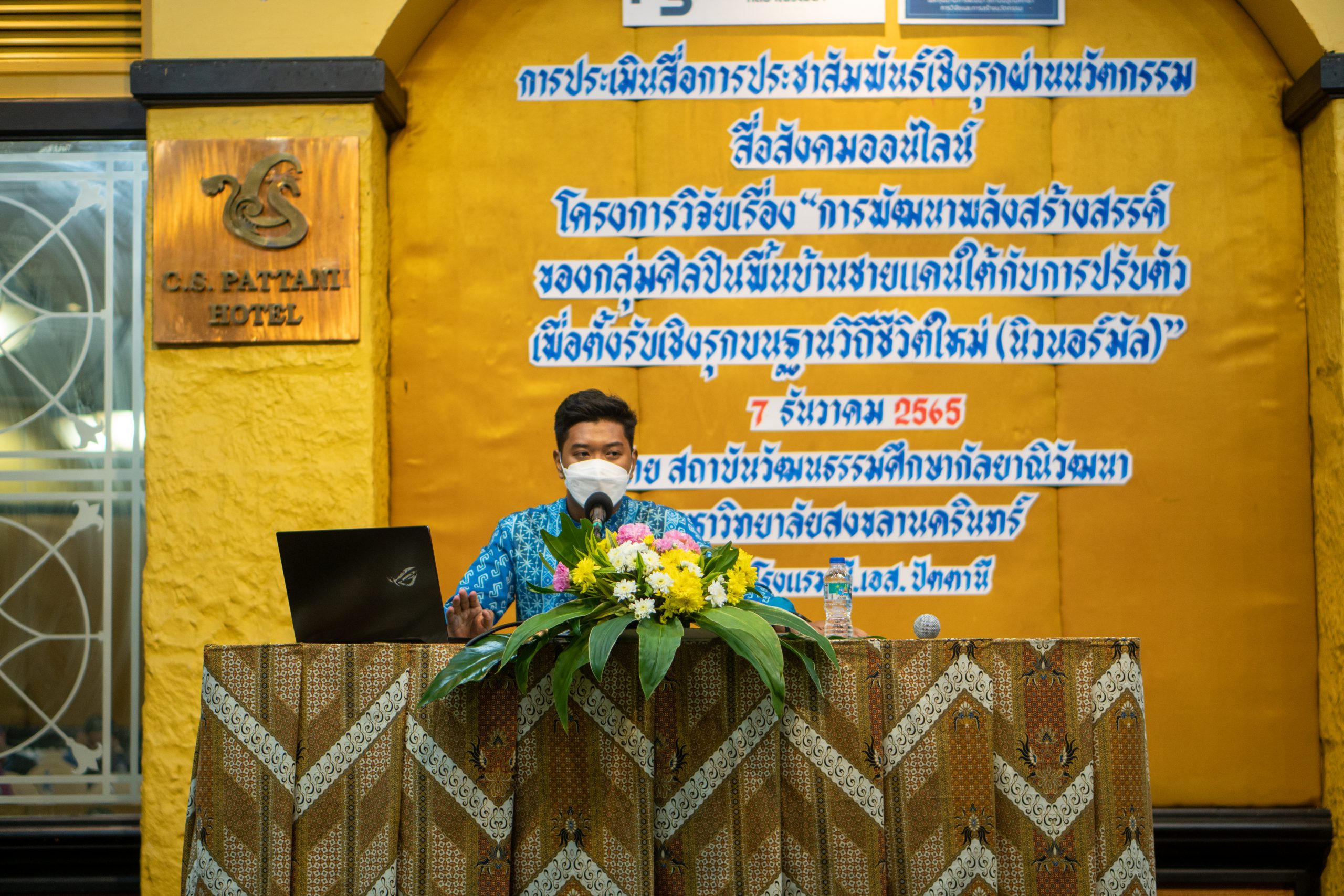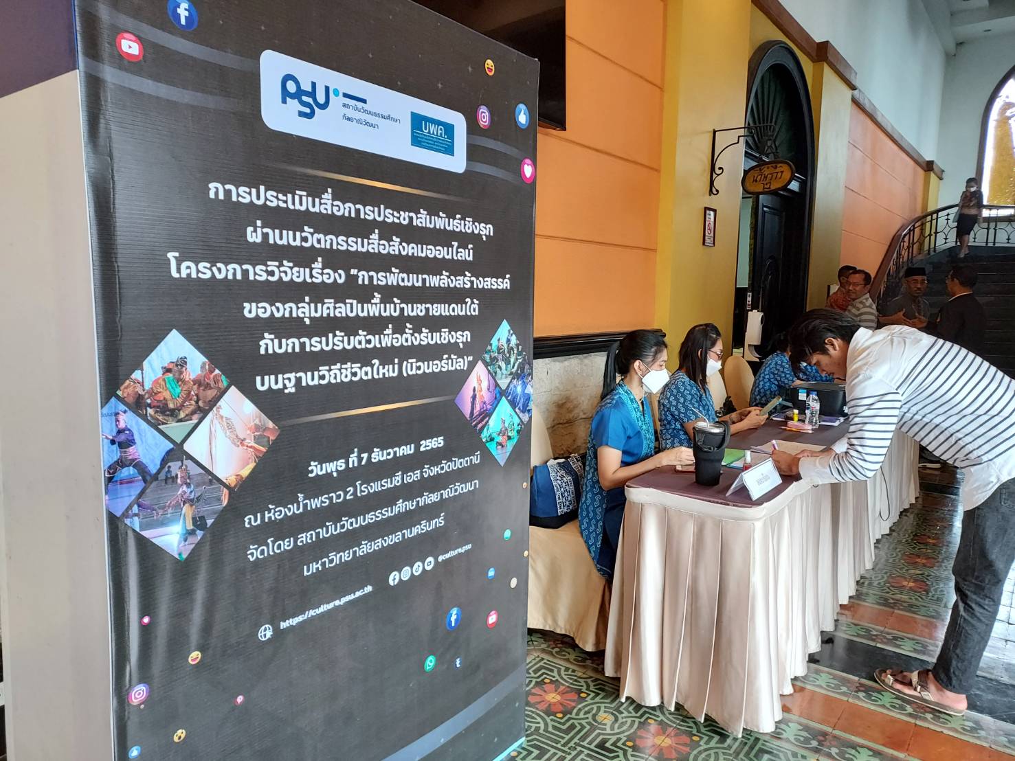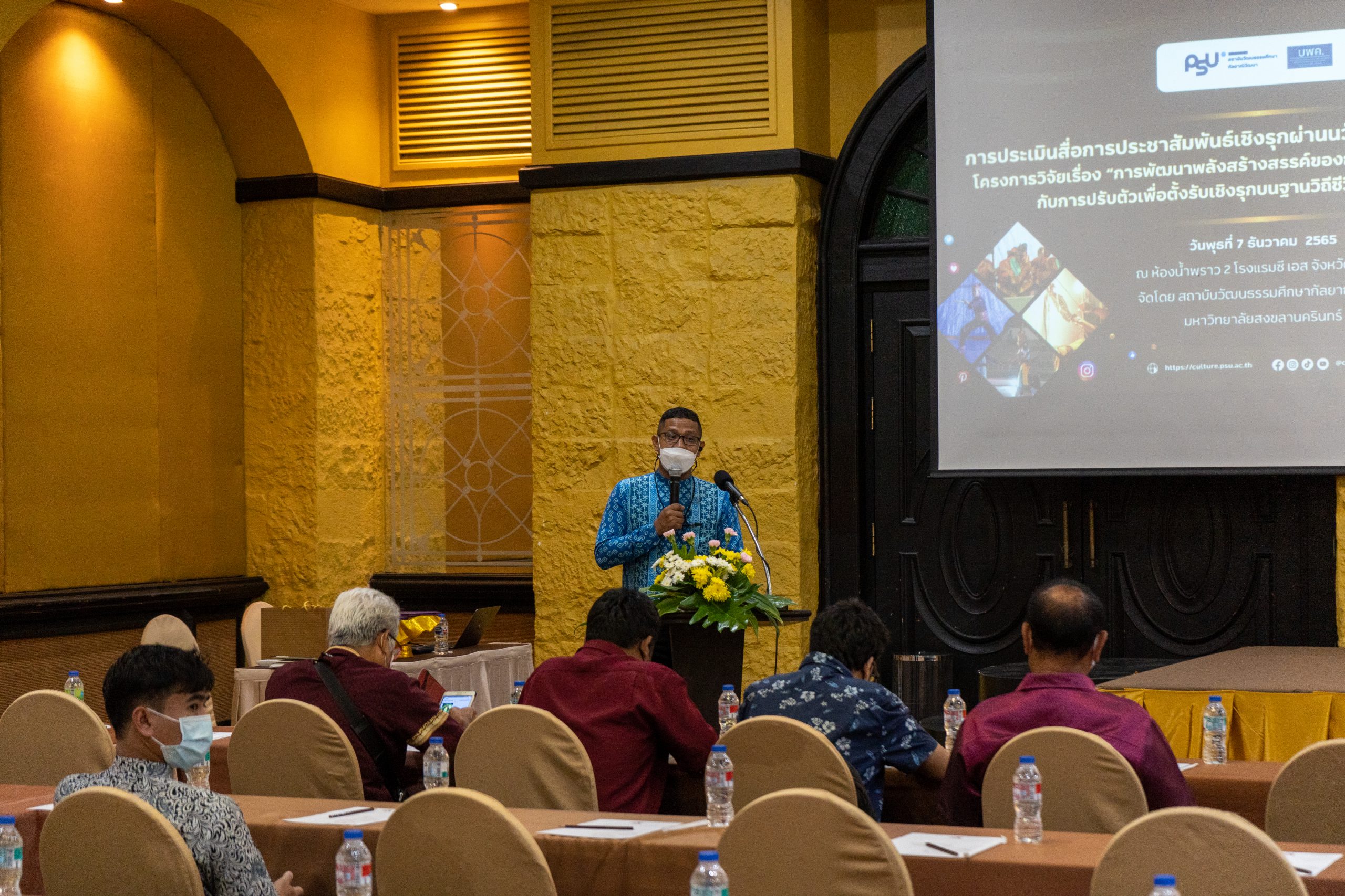 สถาบันวัฒนธรรมศึกษากัลยาณิวัฒนา นำโดย ผู้ช่วยศาสตราจารย์ ดร.พรปวีณ์ พุ่มเกิด หัวหน้าโครงการวิจัยฯ / ผู้อำนวยการ พร้อมกับ ดร.ชนกิตติ์ ธนะสุข รองผู้อำนวยการ และนักวิจัยบุคลากรสถาบันฯ จัดกิจกรรมการประเมินสื่อการประชาสัมพันธ์เชิงรุกผ่านนวัตกรรมสื่อสังคมออนไลน์ โครงการวิจัยเรื่อง “การพัฒนาพลังสร้างสรรค์ของกลุ่มศิลปินพื้นบ้านชายแดนใต้กับการปรับตัวเพื่อตั้งรับเชิงรุกบนฐานวิถีชีวิตใหม่ (นิวนอร์มัล)” โดยมี นางศศิเพ็ญ ละม้ายพันธุ์ วัฒนธรรมจังหวัดปัตตานี เป็นประธานในพิธี และมีตัวแทนจากวัฒนธรรมจังหวัดยะลา นราธิวาส เข้าร่วมด้วย
