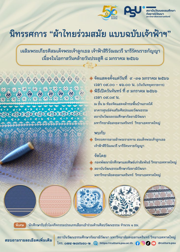 สถาบันวัฒนธรรมศึกษากัลยาณิวัฒนา มหาวิทยาลัยสงขลานครินทร์ วิทยาเขตหาดใหญ่ ร่วมกับ กองพัฒนานักศึกษาและศิษย์เก่าสัมพันธ์ วิทยาเขตหาดใหญ่ ขอเชิญชม นิทรรศการ “ผ้าไทยร่วมสมัย แบบฉบับเจ้าฟ้าฯ” เฉลิมพระเกียรติสมเด็จพระเจ้าลูกเธอ เจ้าฟ้าสิริวัณณวรี นารีรัตนราชกัญญาเนื่องในโอกาสวันคล้ายวันประสูติ ๘ มกราคม ๒๕๖๖