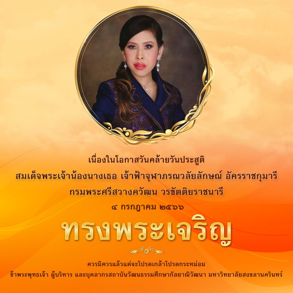ทรงพระเจริญ เนื่องในโอกาสวันคล้ายวันประสูติ สมเด็จพระเจ้าน้องนางเธอ เจ้าฟ้าจุฬาภรณวลัยลักษณ์ อัครราชกุมารี กรมพระศรีสวางควัฒน วรขัตติยราชนารีBy sannusee / 4 กรกฎาคม 2023 ทรงพระเจริญ.เนื่องในโอกาสวันคล้ายวันประสูติ สมเด็จพระเจ้าน้องนางเธอ เจ้าฟ้าจุฬาภรณวลัยลักษณ์ อัครราชกุมารี กรมพระศรีสวางควัฒน วรขัตติยราชนารี.๔ กรกฎาคม ๒๕๖๖.ควรมิควรแล้วแต่จะโปรดเกล้าโปรดกระหม่อม ข้าพระพุทธเจ้า ผู้บริหาร และบุคลากรสถาบันวัฒนธรรมศึกษากัลยาณิวัฒนา มหาวิทยาลัยสงขลานครินทร์ Post Views: 11
