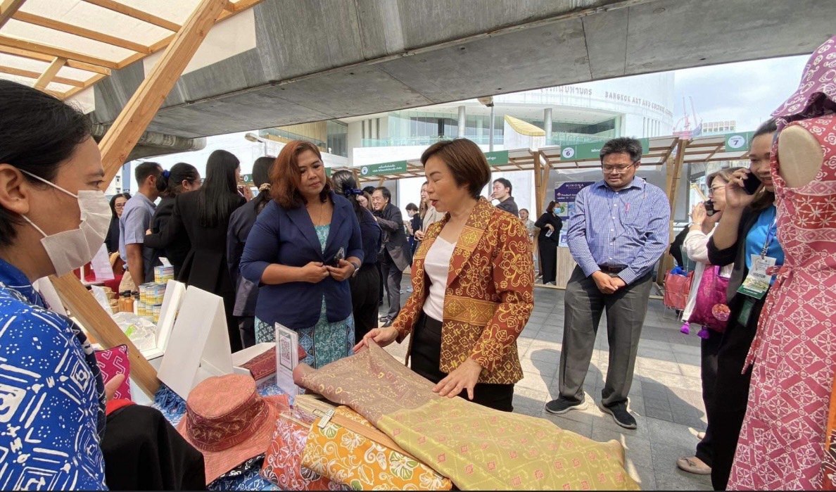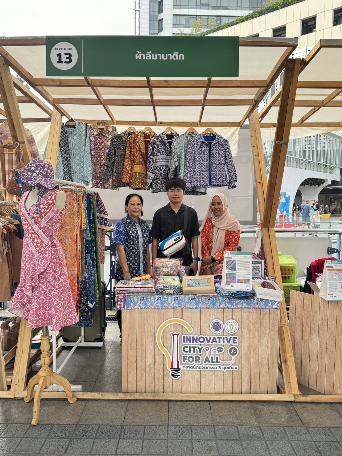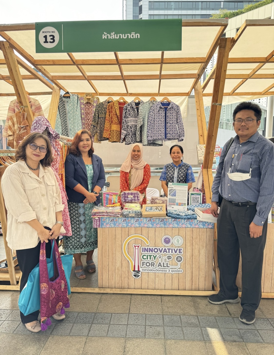 ผู้ช่วยศาสตราจารย์ ดร.พรปวีณ์ พุ่มเกิด ผู้อำนวยการฯ และบุคลากรสถาบันฯ, ผู้ประกอบการ CIA (Cultural integrated added-value) ร่วมจัดบูธนิทรรศการ “ผ้าลีมาบาติก” ในงาน “ตลาดนัดนวัตกรรม 3 มุมเมือง” ระหว่างวันที่ 1 – 3 กุมภาพันธ์ 2567 เวลา 09.00 – 16.00 น. ณ หอศิลปวัฒนธรรมแห่งกรุงเทพมหานคร และบริเวณลาน Skywalk สี่แยกปทุมวัน โดยมีวัตถุประสงค์เพื่อแสดงผลงานวิจัยและนวัตกรรมของ อว. และหน่วยงานในสังกัดให้เป็นที่ประจักษ์ต่อสังคม และสนับสนุนการนำผลงานวิจัยและนวัตกรรมเกี่ยวกับเมืองและชุมชนท้องถิ่นโดย อว. ไปใช้ให้เกิดประโยชน์อย่างเป็นรูปธรรม ในการนี้ ท่านสุชาดา แทนทรัพย์ เลขานุการรัฐมนตรีว่าการกระทรวงการอุดมศึกษา วิทยาศาสตร์ วิจัยและนวัตกรรม (อว.) และท่านผู้ช่วยศาสตราจารย์ ดร.ทวิดา กมลเวชช ท่านรองผู้ว่าราชการกรุงเทพมหานคร ได้เยี่ยมชมและเลือกซื้อผลิตภัณฑ์