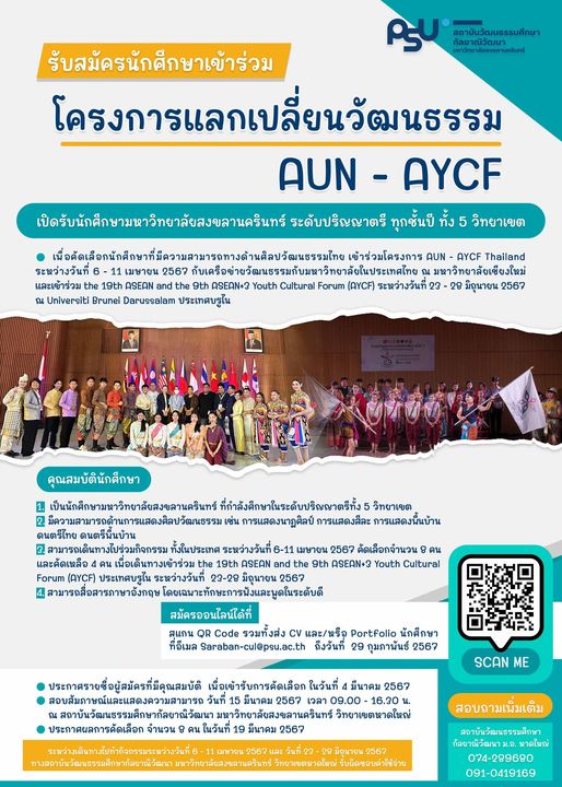 หรือสแกน QR Code รวมทั้งส่ง CV และ/หรือ Portfolio นักศึกษา ที่อีเมล Saraban-cul@psu.ac.th ถึงวันที่ 29 กุมภาพันธ์ 2567