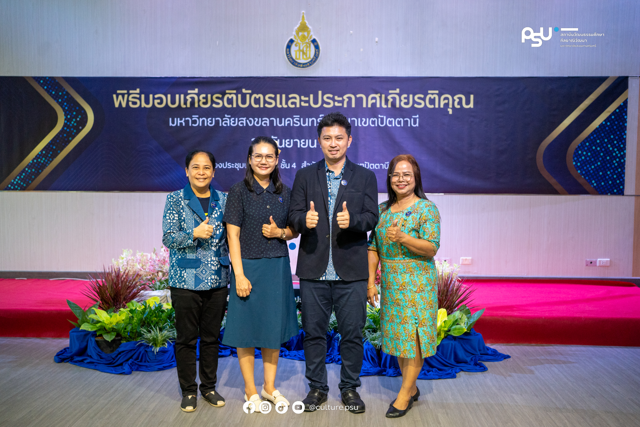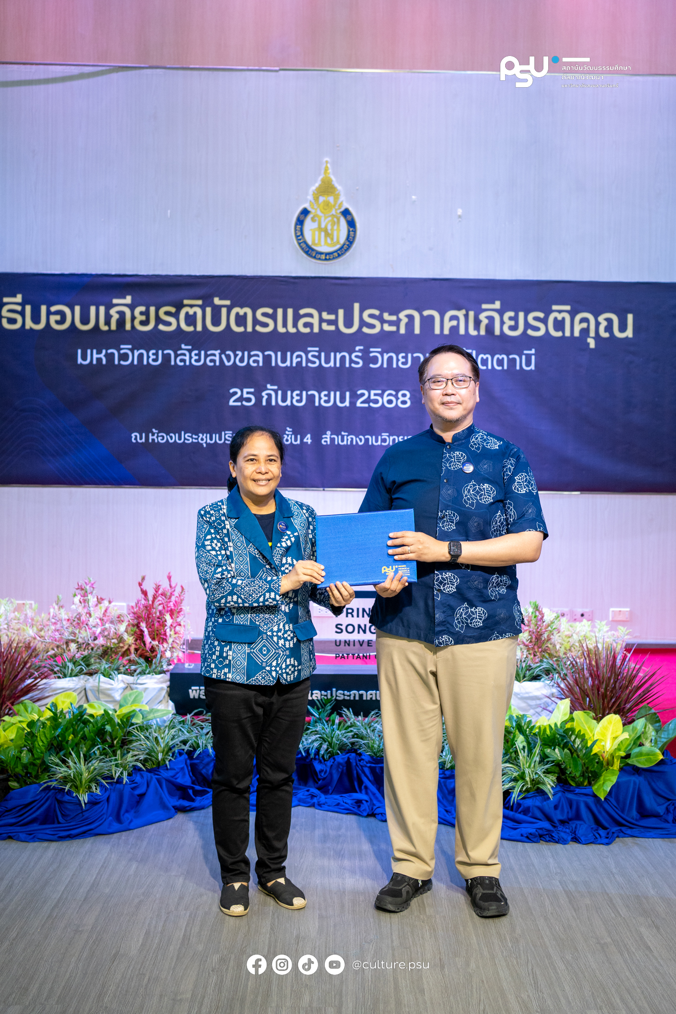 วันที่ 25 กันยายน 2568 มหาวิทยาลัยสงขลานครินทร์ วิทยาเขตปัตตานี จัดพิธีมอบเกียรติบัตรและประกาศเกียรติคุณ “บุคลากรดีเด่น ประจำปี 2568” ณ ห้องประชุมปริชญากร ชั้น 4 สำนักงานวิทยาเขตปัตตานี เพื่อเชิดชูเกียรติและสร้างขวัญกำลังใจแก่บุคลากรที่ทุ่มเทแรงกายแรงใจในการปฏิบัติหน้าที่และเป็นแบบอย่างที่ดี