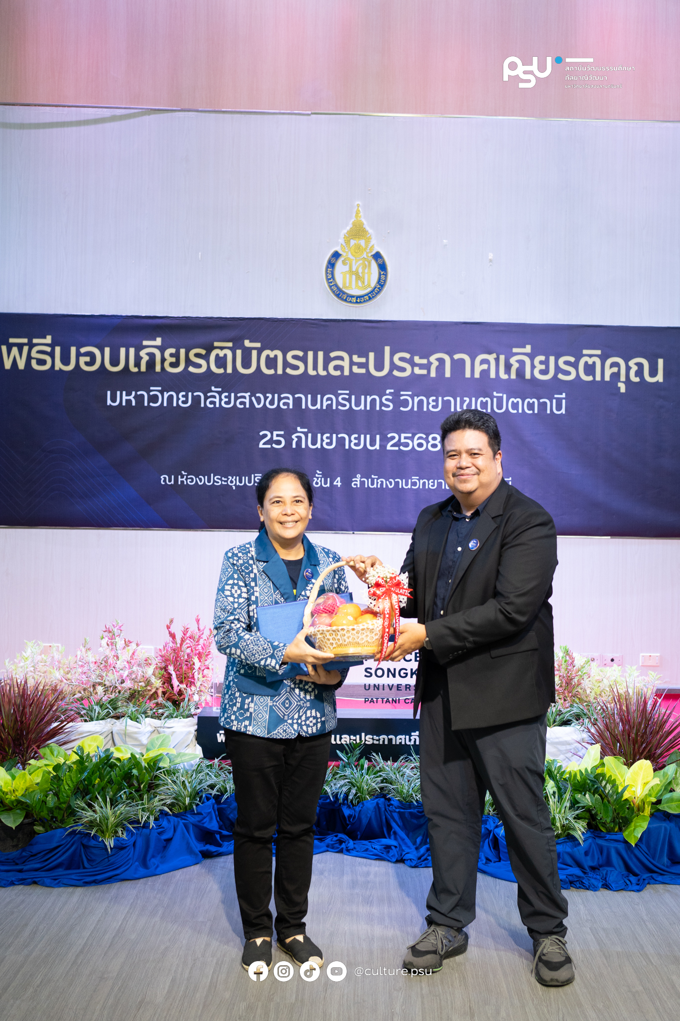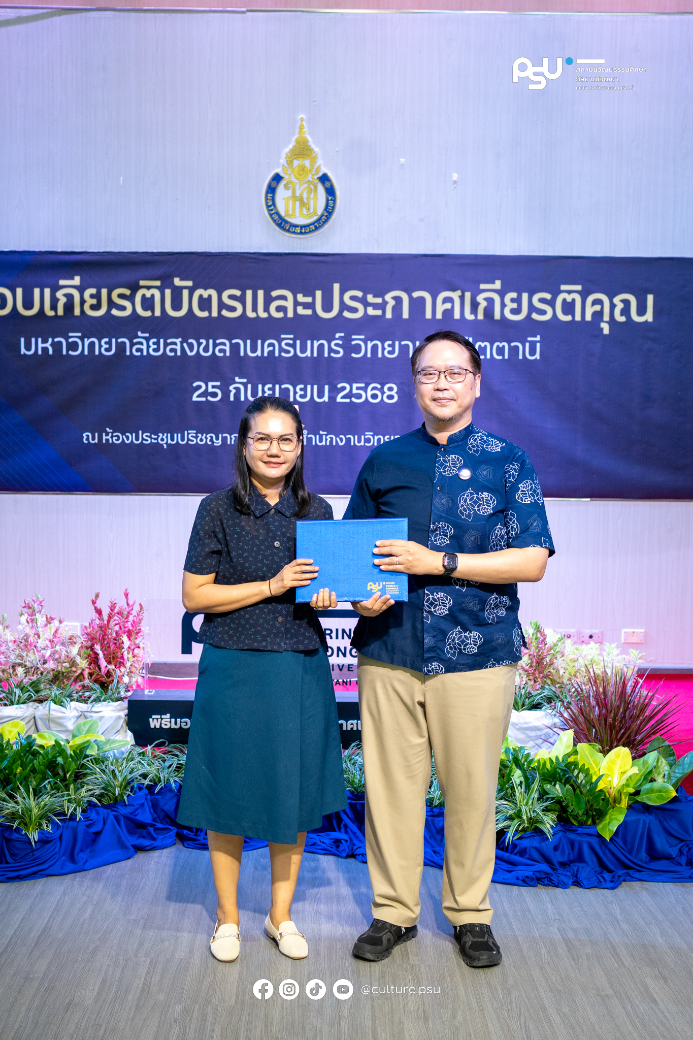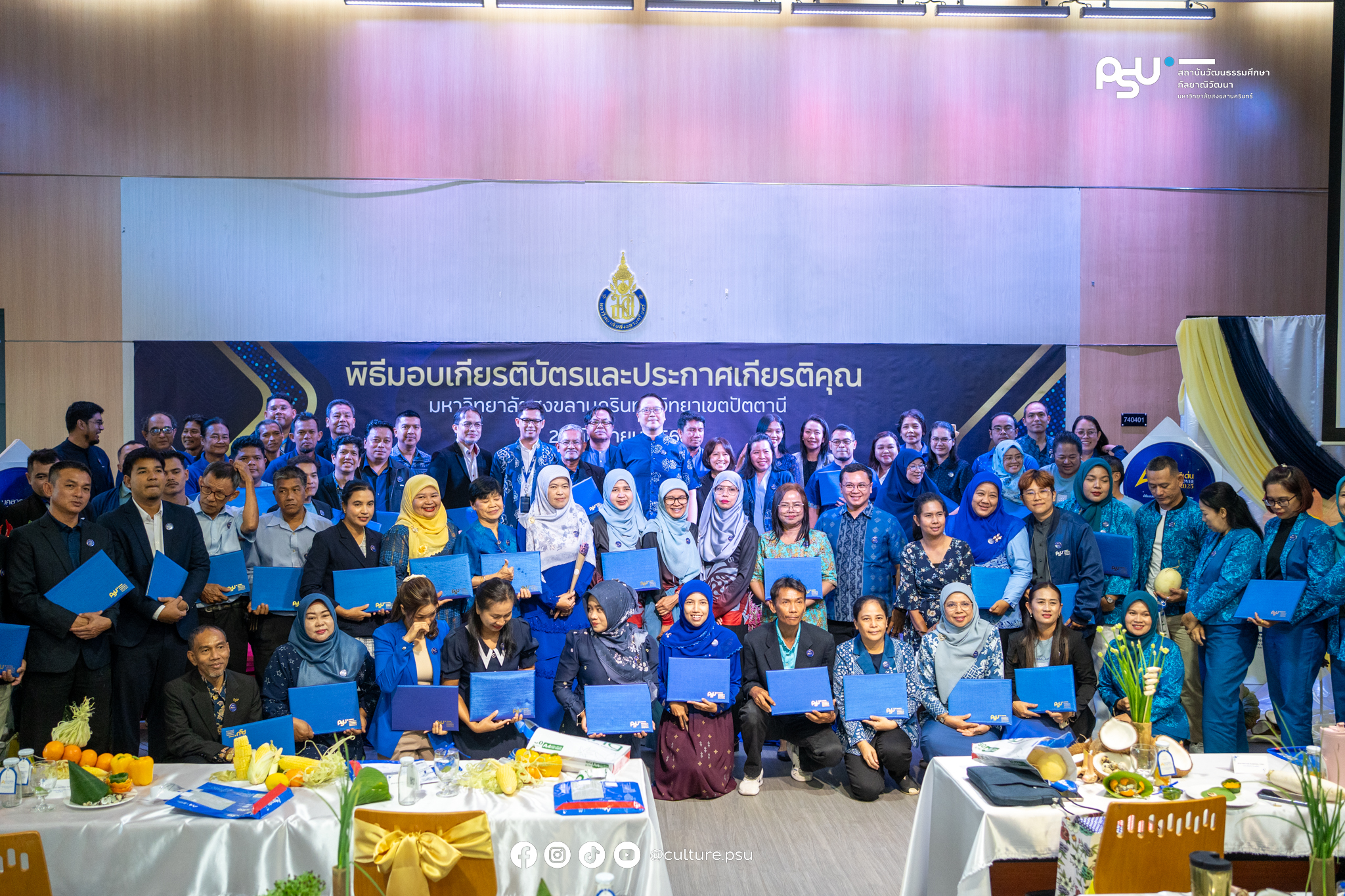 วันที่ 25 กันยายน 2568 มหาวิทยาลัยสงขลานครินทร์ วิทยาเขตปัตตานี จัดพิธีมอบเกียรติบัตรและประกาศเกียรติคุณ “บุคลากรดีเด่น ประจำปี 2568” ณ ห้องประชุมปริชญากร ชั้น 4 สำนักงานวิทยาเขตปัตตานี เพื่อเชิดชูเกียรติและสร้างขวัญกำลังใจแก่บุคลากรที่ทุ่มเทแรงกายแรงใจในการปฏิบัติหน้าที่และเป็นแบบอย่างที่ดี