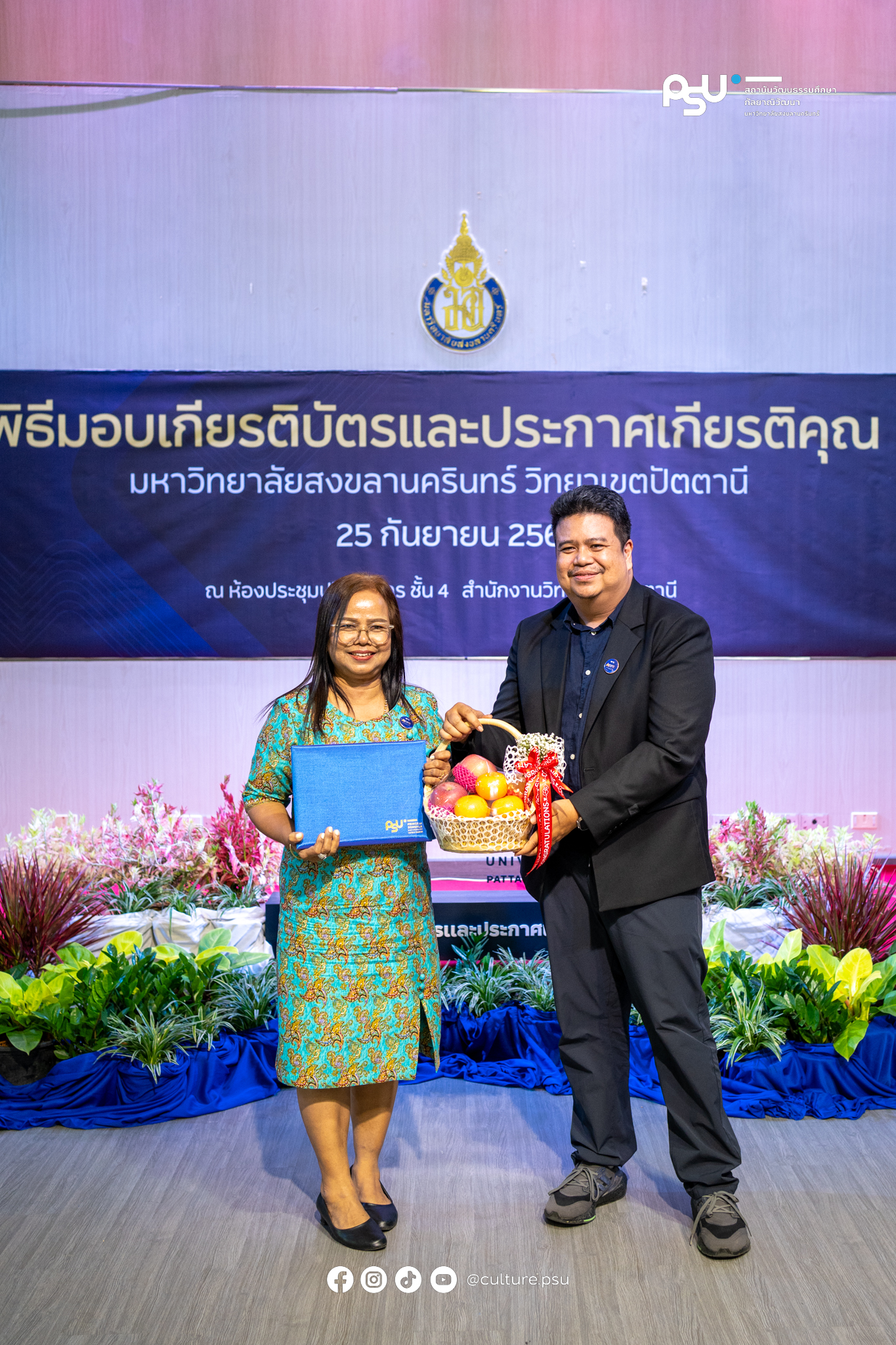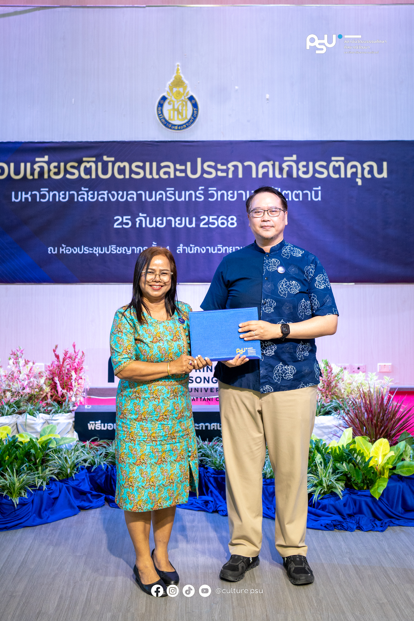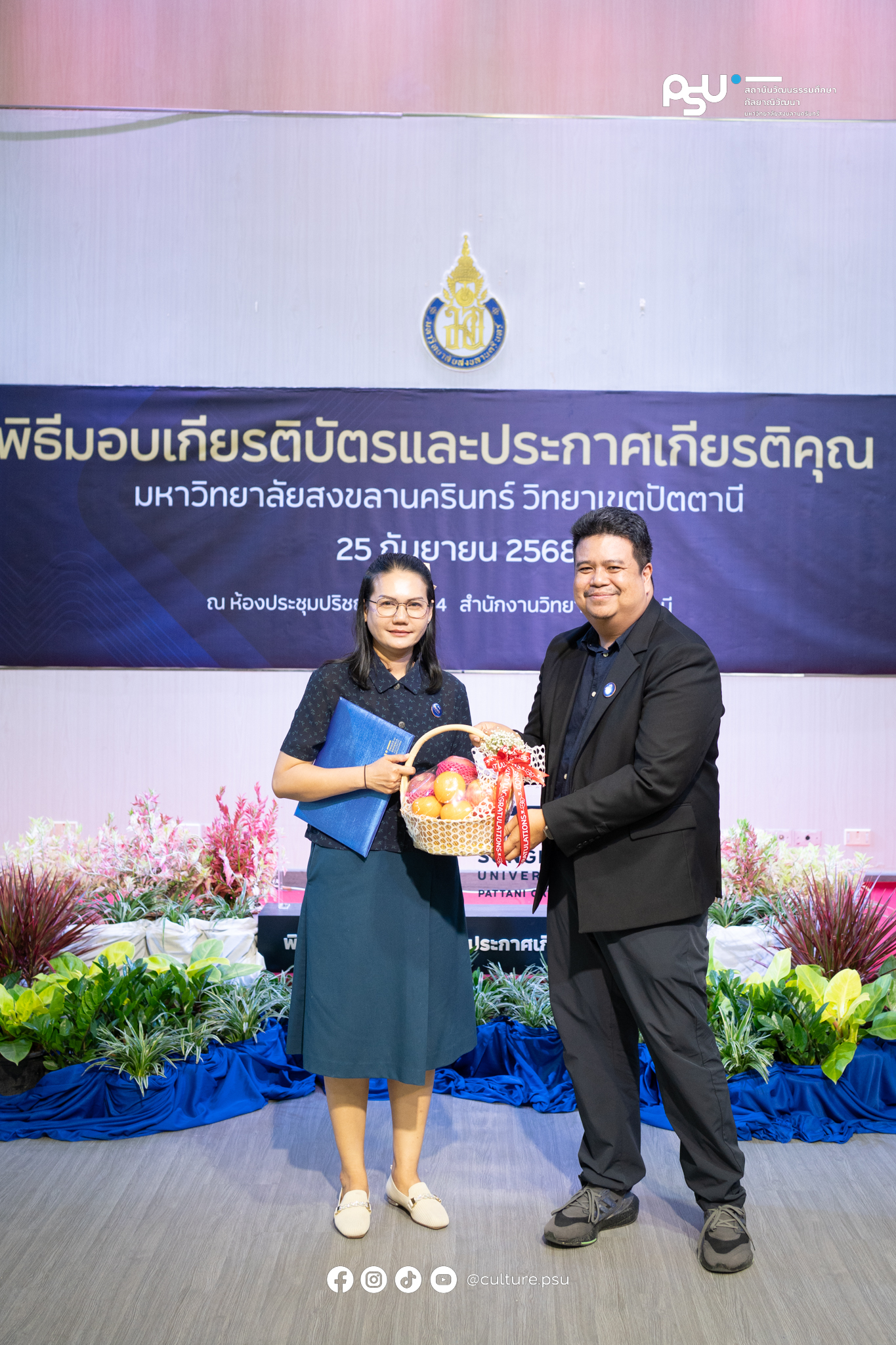 วันที่ 25 กันยายน 2568 มหาวิทยาลัยสงขลานครินทร์ วิทยาเขตปัตตานี จัดพิธีมอบเกียรติบัตรและประกาศเกียรติคุณ “บุคลากรดีเด่น ประจำปี 2568” ณ ห้องประชุมปริชญากร ชั้น 4 สำนักงานวิทยาเขตปัตตานี เพื่อเชิดชูเกียรติและสร้างขวัญกำลังใจแก่บุคลากรที่ทุ่มเทแรงกายแรงใจในการปฏิบัติหน้าที่และเป็นแบบอย่างที่ดี