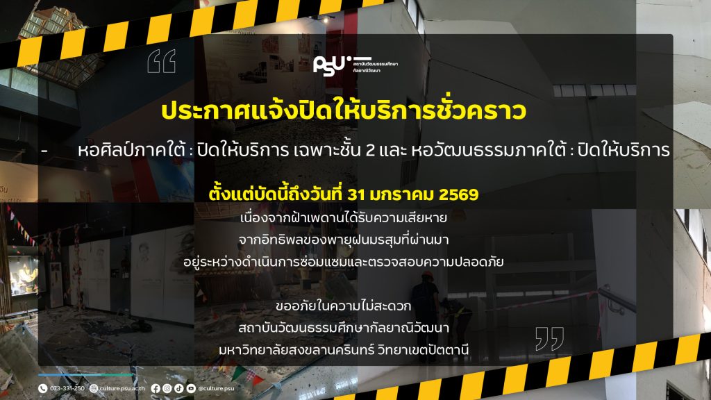 ประกาศแจ้งปิดให้บริการชั่วคราว (เพิ่มเติม) หอศิลป์ภาคใต้ : ปิดให้บริการ เฉพาะชั้น 2 หอวัฒนธรรมภาคใต้ : ปิดให้บริการ