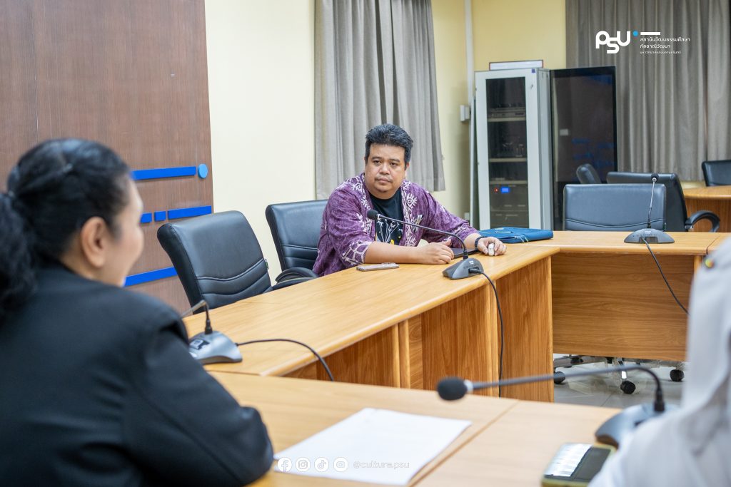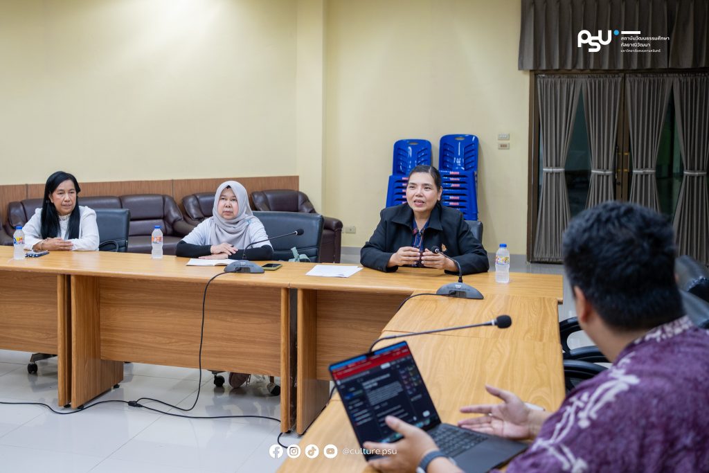7 มกราคม 2569 ดร.ชนกิตติ์ ธนะสุข ผู้อำนวยการ พร้อมรองผู้อำนวยการ และบุคลากรสถาบันวัฒนธรรมศึกษากัลยาณิวัฒนา ให้การต้อนรับคณะกลุ่มกิจการพิเศษ จากสำนักงานวัฒนธรรมจังหวัดปัตตานี เข้าพบเพื่อหารือแนวทางการบูรณาการจัดกิจกรรมด้านศิลปะและวัฒนธรรม ประจำปีงบประมาณ พ.ศ. 2569 ตลอดจนการทำงานร่วมกันระหว่างมหาวิทยาลัยกับหน่วยงานด้านวัฒนธรรมในพื้นที่ ณ ห้องประชุมสถาบันวัฒนธรรมศึกษากัลยาณิวัฒนา