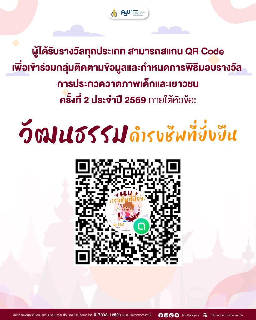 🔗 ผู้ได้รับรางวัลทุกประเภท สามารถสแกน QR Code ท้ายประกาศนี้ เพื่อเข้าร่วมกลุ่มติดตามข้อมูลและกำหนดการพิธีมอบรางวัล ได้ตามลิงก์ที่แนบไว้ https://link.psu.th/7Zmk3P