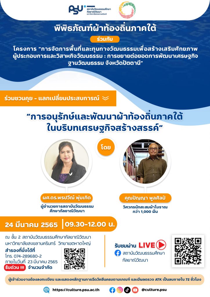 โครงการ “การจัดการพื้นที่และทุนทางวัฒนธรรมเพื่อสร้างเสริมศักยภาพ ผู้ประกอบการและวิสาหกิจวัฒนธรรม : การขยายต่อยอดการพัฒนาเศรษฐกิจฐานวัฒนธรรม จังหวัดปัตตานี”By sannusee / 18 มีนาคม 2022 วันที่ 24 มีนาคม 2565 พิพิธภัณฑ์ผ้าท้องถิ่นภาคใต้ ร่วมกับ โครงการ “การจัดการพื้นที่และทุนทางวัฒนธรรมเพื่อสร้างเสริมศักยภาพ ผู้ประกอบการและวิสาหกิจวัฒนธรรม : การขยายต่อยอดการพัฒนาเศรษฐกิจฐานวัฒนธรรม จังหวัดปัตตานี” นำโดย ผู้ช่วยศาสตราจารย์ ดร.พรปวีณ์ พุ่มเกิด ผู้อำนวยการสถาบันฯ นำทีมวิทยากร คุณปัญญา พูลศิลป์ วิศวกรนักสะสมผ้าโบราณกว่า 1,000 ผืน, คุณสุกัญญา หมวกแดง ช่างทอผ้าจวนตานี กลุ่มสตรีทอผ้าจวนบ้านตรัง อำเภอมายอ จังหวัดปัตตานี, คุณนราวดี โลหะจินดา, และคุณโชติรส ตันจ้อย ร่วมชวนคุย – แลกเปลี่ยนเรียนรู้ เรื่อง “การอนุรักษ์และพัฒนาผ้าท้องถิ่นภาคใต้ในบริบทเศรษฐกิจสร้างสรรค์” เพื่อพัฒนา อนุรักษ์ สืบทอดและต่อยอดศิลปะวัฒนธรรมผ้าท้องถิ่นภาคใต้ ภายใต้การอนุรักษ์และพัฒนาผ้าท้องถิ่นใต้ในบริบท “เศรษฐกิจสร้างสรรค์” ณ ชั้น ๒ สถาบันวัฒนธรรมศึกษากัลยาณิวัฒนา มหาวิทยาลัยสงขลานครินทร์ วิทยาเขตหาดใหญ่ Post Views: 20