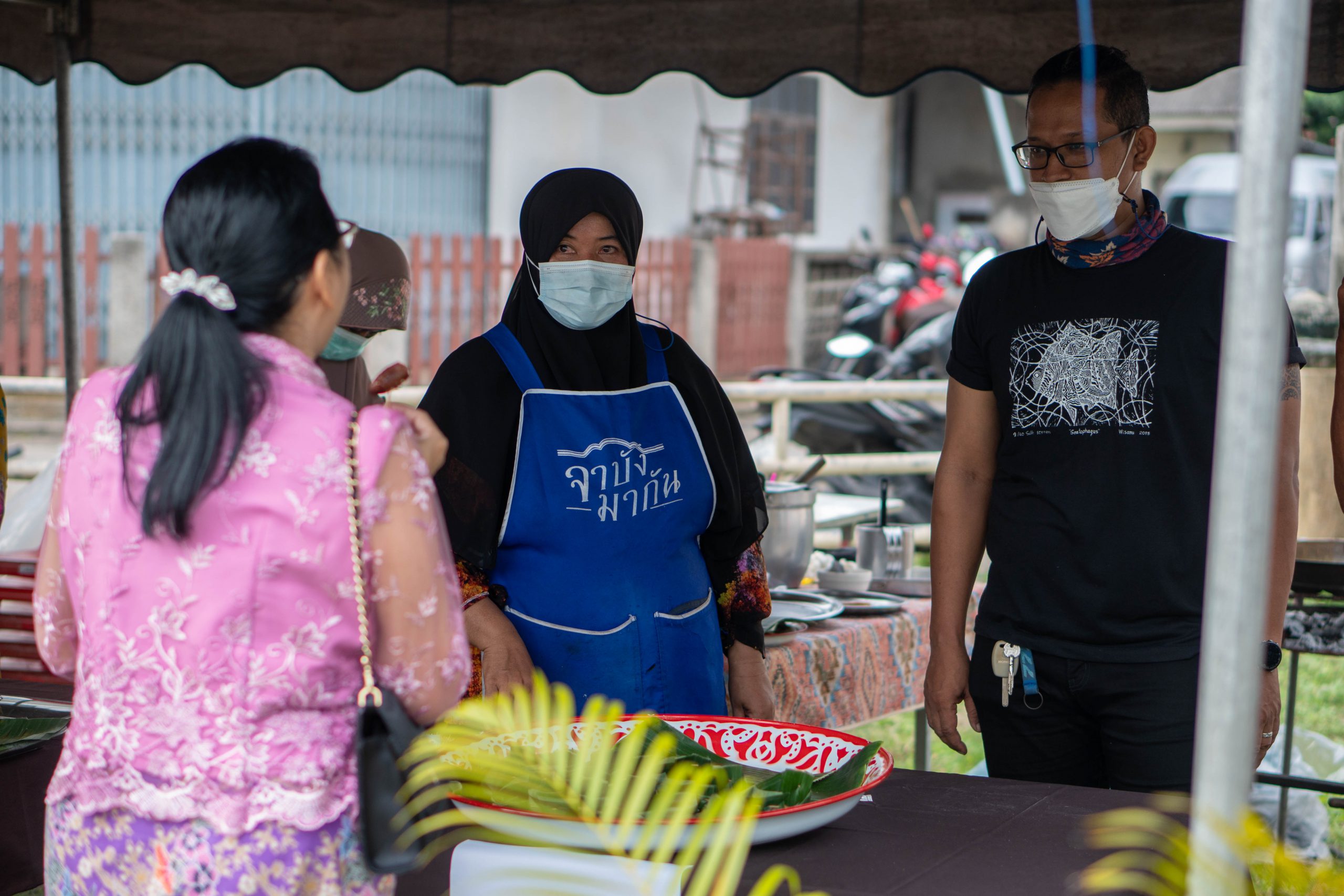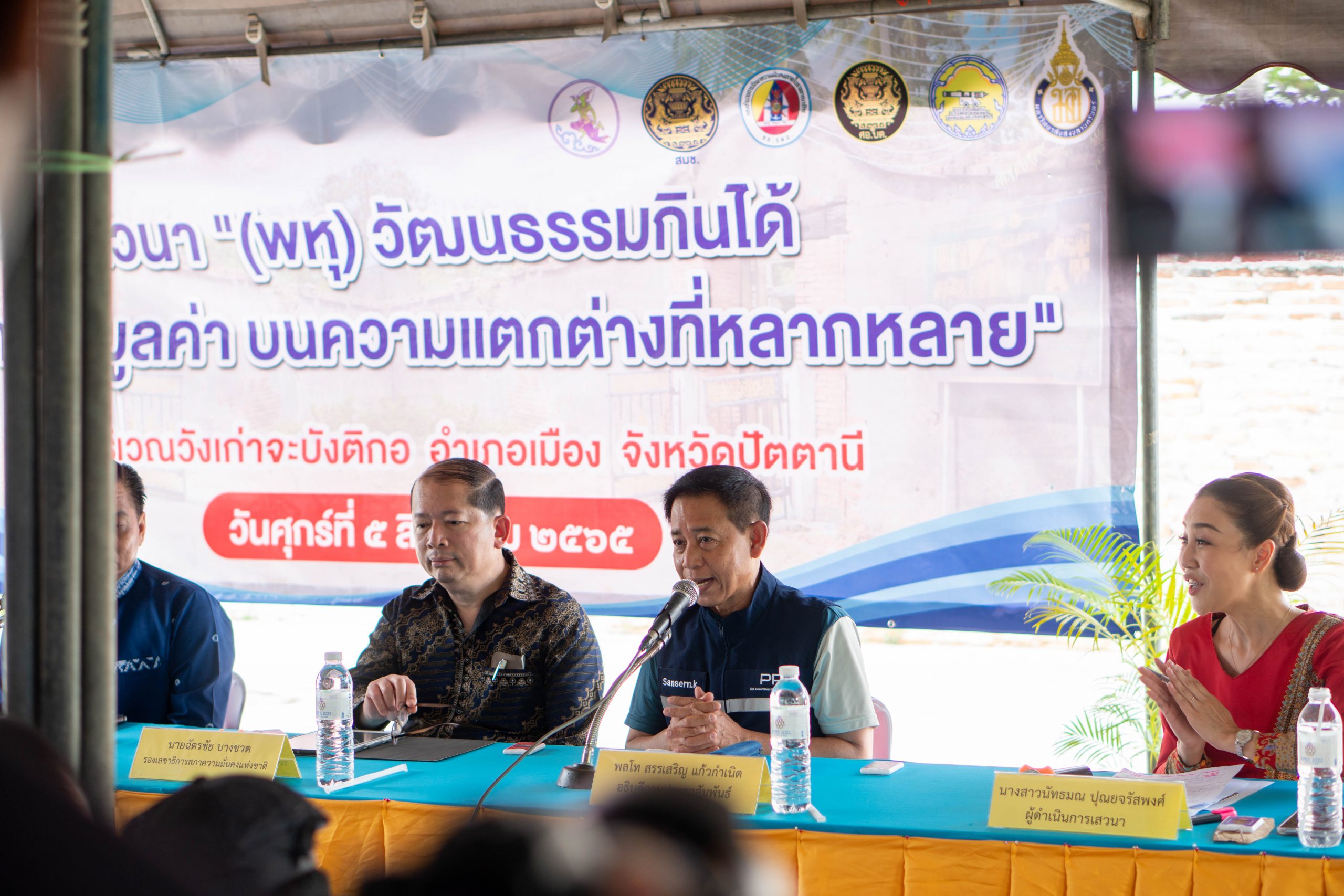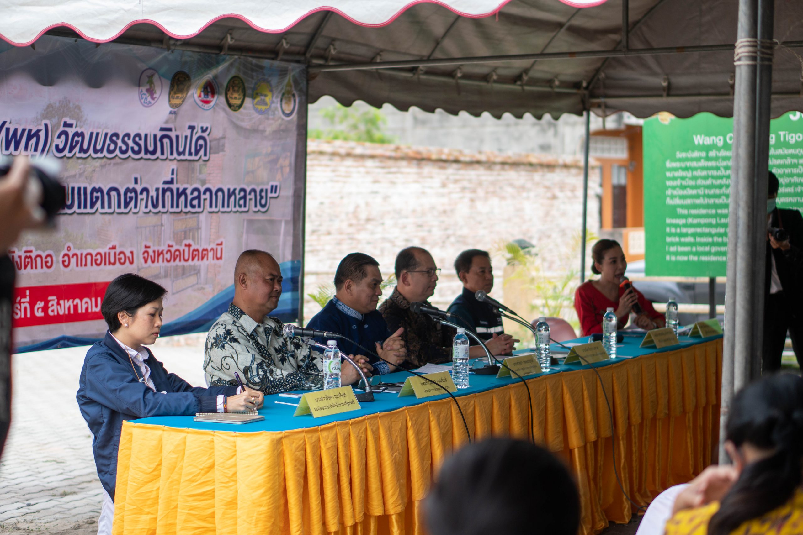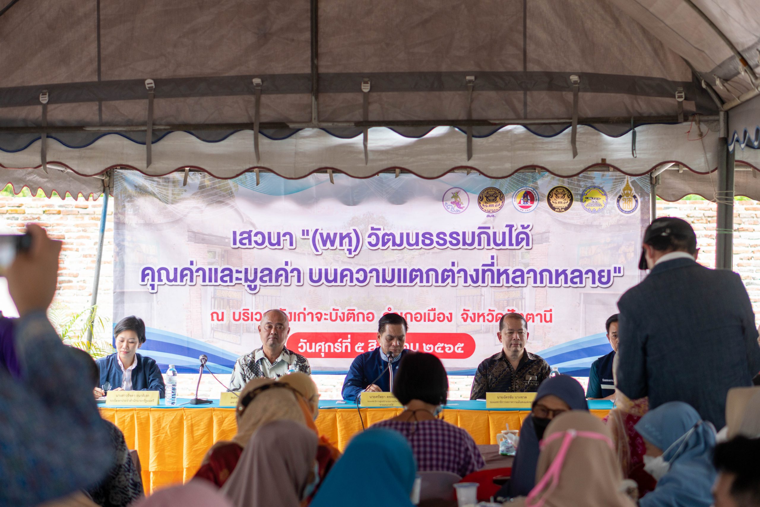 รศ.อิ่มจิต เลิศพงษ์สมบัติ รองอธิการบดีวิทยาเขตปัตตานี และผู้ช่วยศาสตราจารย์ ดร.พรปวีณ์ พุ่มเกิด ผู้อำนวยการสถาบันฯ ร่วมรับฟังการเสวนา “(พหุ) วัฒนธรรมกินได้ คุณค่าและมูลค่าบนความแตกต่างที่หลากหลาย” ณ บริเวณหน้าวังจะบังติกอ อ.เมือง จ.ปัตตานี ภายในงานประกอบด้วยนิทรรศการภาพเก่าชุมชนจะบังติกอโดยกลุ่ม U2T ตำบลจะบังติกอภายใต้การดูแลของสถาบันฯ และการสาธิตอาหารพื้นถิ่นของกลุ่มผู้ประกอบการอาหารพื้นถิ่นตลาดจาบังมากัน เพื่อร่วมต้อนรับผู้เข้าร่วมเสวนา