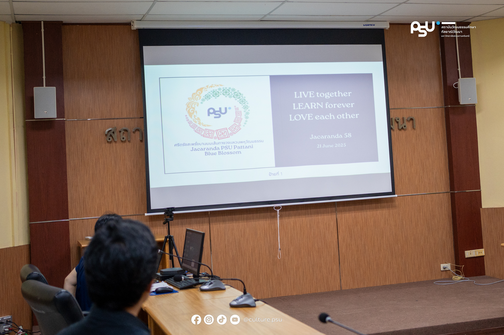 ดร.ชนกิตติ์ ธนะสุข ผู้อำนวยการ พร้อมด้วย ดร.ปิติ มณีเนตร รองผู้อำนวยการ และบุคลกรสถาบันวัฒนธรรมศึกษากัลยาณิวัฒนา ต้อนรับ ผู้ช่วยศาสตราจารย์ ดร.บดินทร์ แวลาเตะ รองอธิการบดีฝ่ายพัฒนานักศึกษา และศิษย์เก่าสัมพันธ์ วิทยาเขตปัตตานี และกองพัฒนานักศึกษาวิทยาเขตปัตตานี ร่วมประชุมการจัดกิจกรรมศรีตรังสะพรั่งบาน ประจำปี 2568 บนเส้นทางวงแหวนพหุวัฒนธรรมเมืองปัตตานี